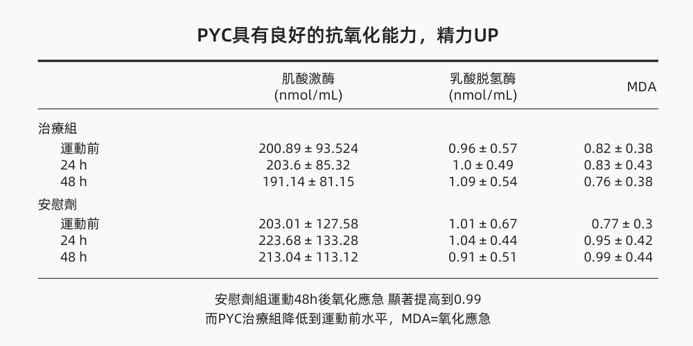 Clinical Confirmation:Polymer PYC enhances antioxidant capacity, rapidly boosts muscle endurance, and revives energy.
