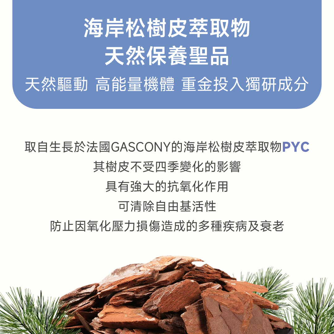 Sourced from coastal pine trees in Gascony, France, its bark is unaffected by seasonal changes. The plant compounds possess powerful antioxidant properties, helping eliminate free radicals and prevent oxidative stress-induced diseases and aging.