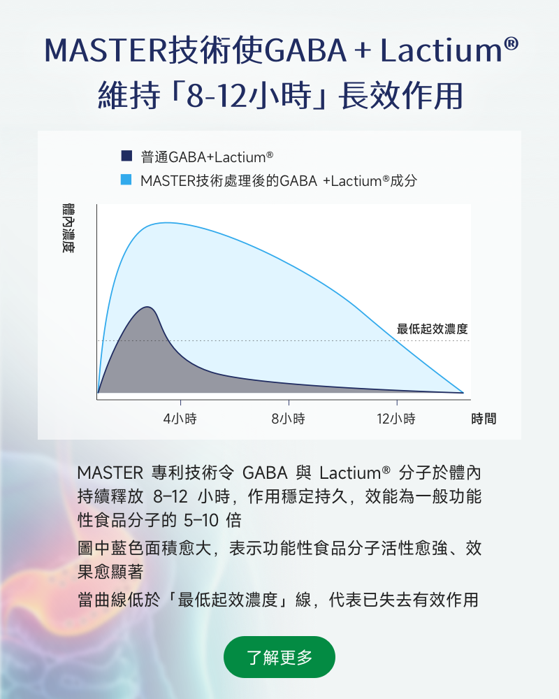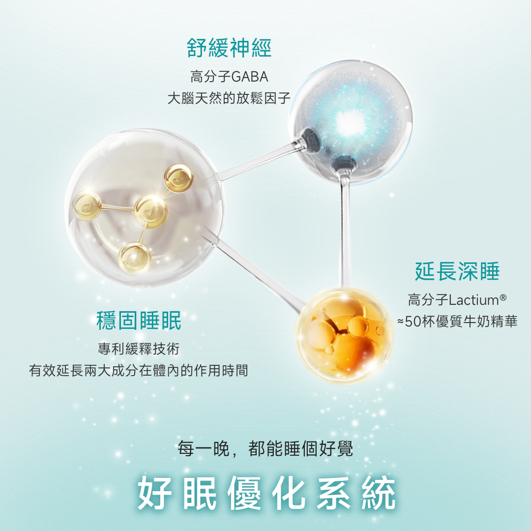 GABA + Lactium® dual-action formula with patented sustained-release technology helps relax the body, extend deep sleep, and improve overall sleep quality.