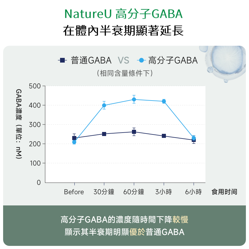 High-molecular GABA is enhanced via proprietary patented technology. Compared to regular GABA, it has a significantly longer half-life and 5–10× improved bioavailability—delivering up to 6 hours of sustained effect, more stable deep sleep, and fewer nighttime awakenings.