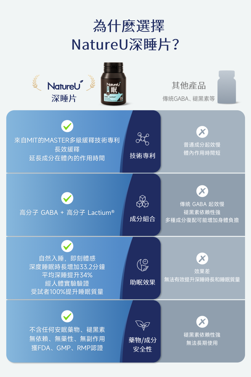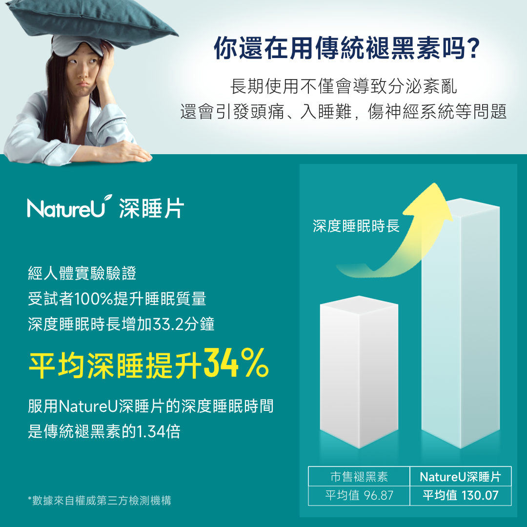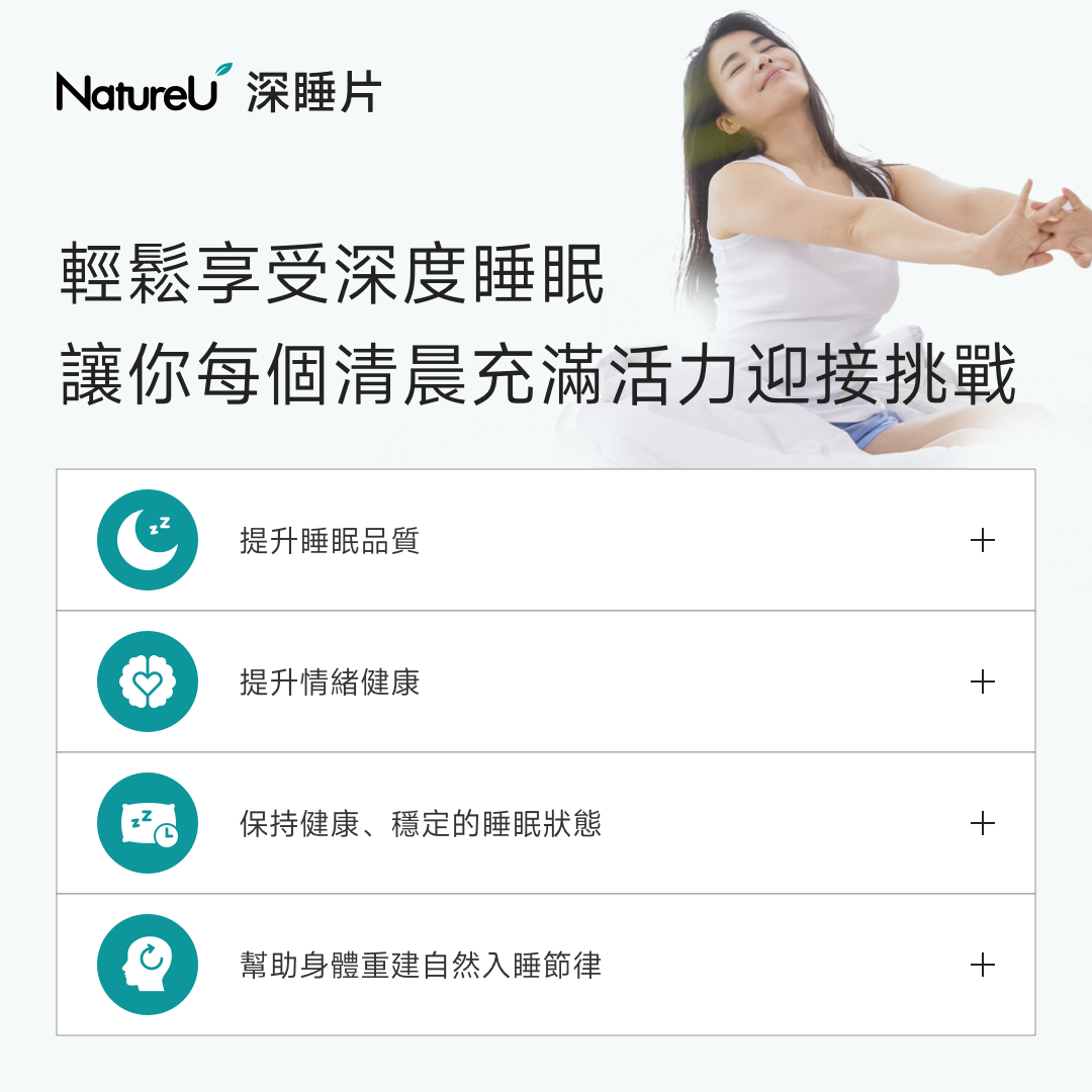 【NatureU Deep Sleep Tablets】6–8 Hours of Deep Sleep · Reset Natural Sleep Rhythm Specifically designed for stress-induced and anxiety-related insomnia, or for those unresponsive to melatonin.