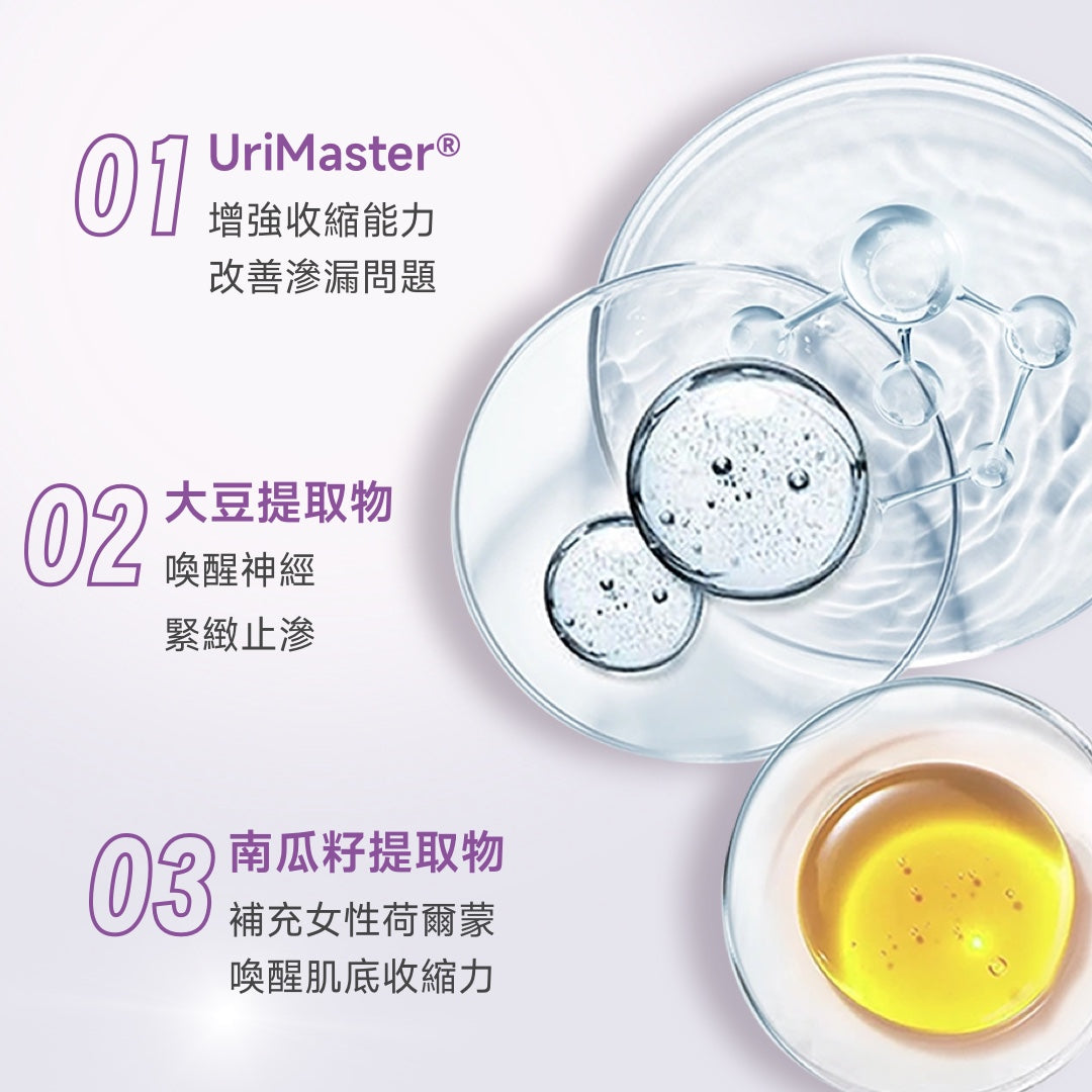 The key difference lies in the "Exclusive Patent Technology + Ingredients": First, the UriMaster® technology solves the problem of low ingredient absorption efficiency in regular products; second, it uses a synergistic formula of "Patent Ingredients + Dual Extracts" instead of a single ingredient, targeting both immediate issues (like leakage and dryness) and providing long-term protection.