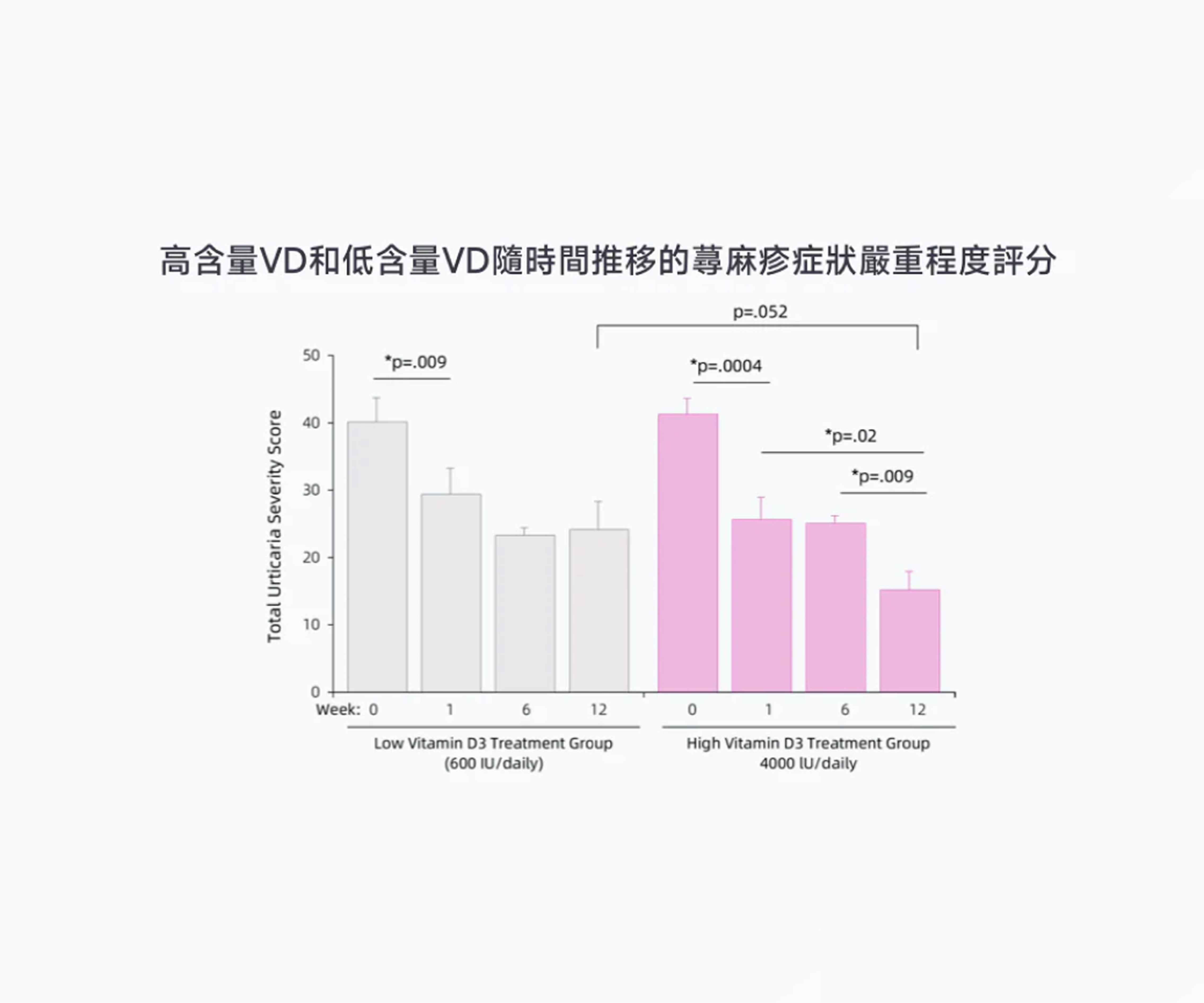 Studies show that in a group of 42 chronic urticaria patients who took 4000 IU of Vitamin D3 daily (compared to a control group taking 600 IU), the high-dose group experienced a 40% reduction in symptoms after 12 weeks (p<0.05).