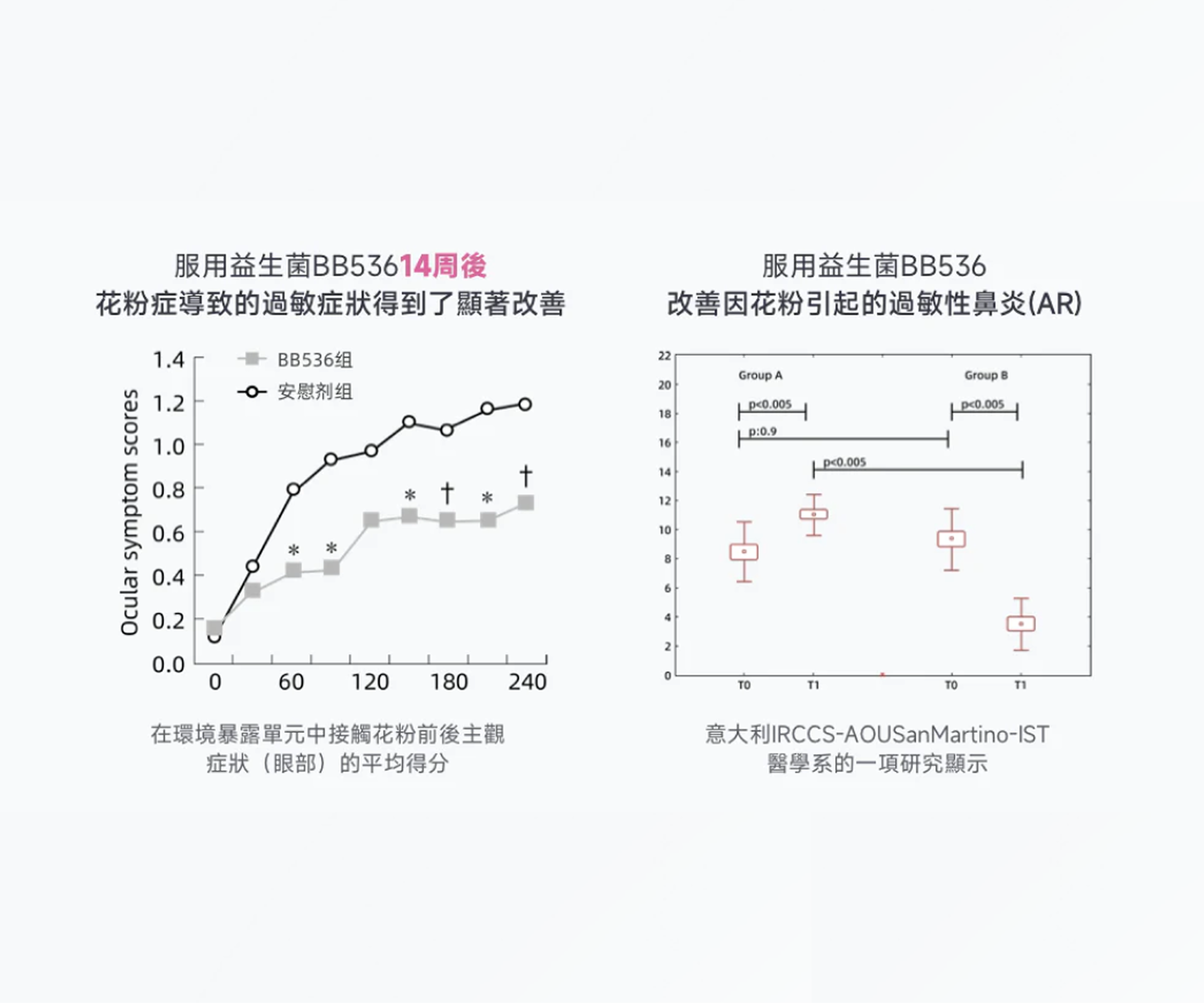 Studies confirm that after 14 weeks of BB536 supplementation, allergy symptoms caused by pollen, such as eye discomfort, significantly improved (p<0.005). Italian IRCCS medical research also shows BB536’s effectiveness in alleviating symptoms of allergic rhinitis (AR) caused by pollen (p<0.005).