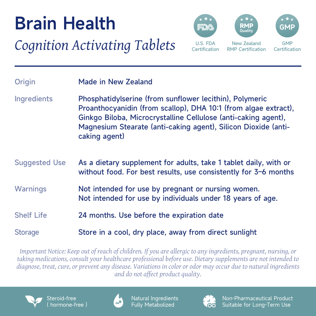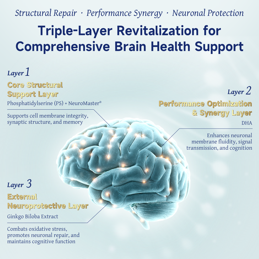 ✅ Layer 1: Core Structural Support (PS + NeuroMaster®) Supports cell membrane integrity and synaptic structure, forming a closed-loop system of repair and protection to enhance memory efficiency.