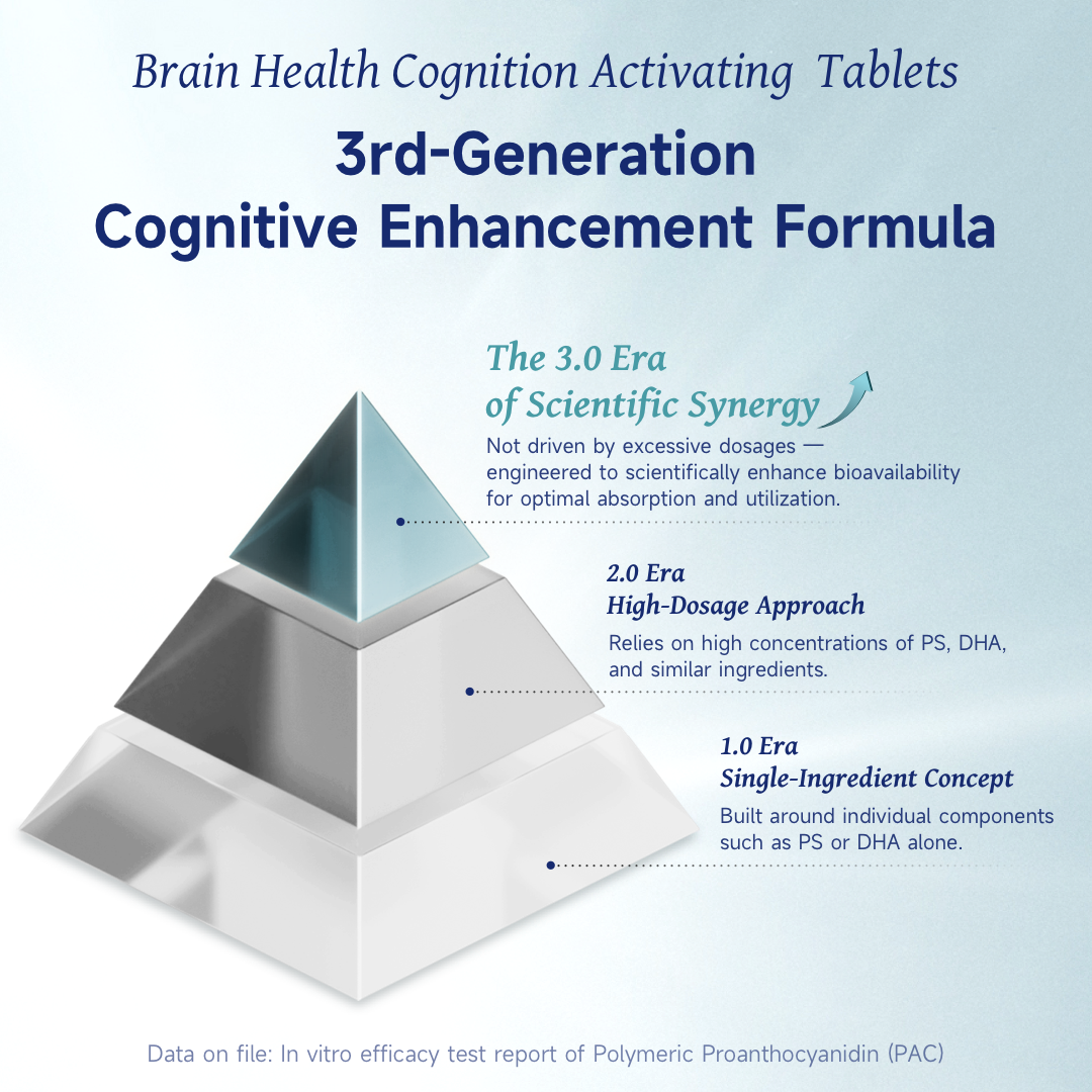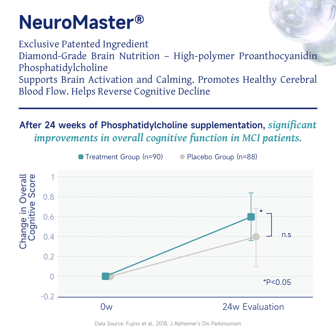 Reinforces neuronal structure and works synergistically with Phosphatidylserine (PS) to form a “Deep Repair + Long-Term Protection” cycle. This synergy helps stabilize repair outcomes and reduce oxidative stress.Clinical studies show that after 24 weeks, NeuroMaster® supplementation supports improvements in spatial cognition, attention, and processing ability in individuals with mild cognitive impairment, with a control rate of up to 88.8% in moderate cases.