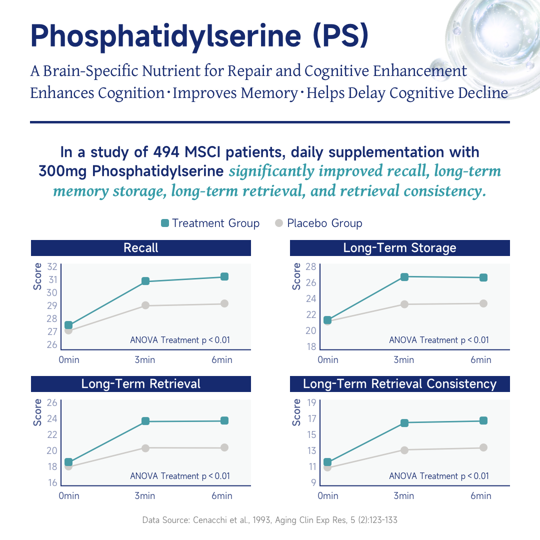 • Phosphatidylserine (PS): In a study of 494 participants, daily supplementation significantly supported memory-related functions (ANOVA treatment p < 0.01).