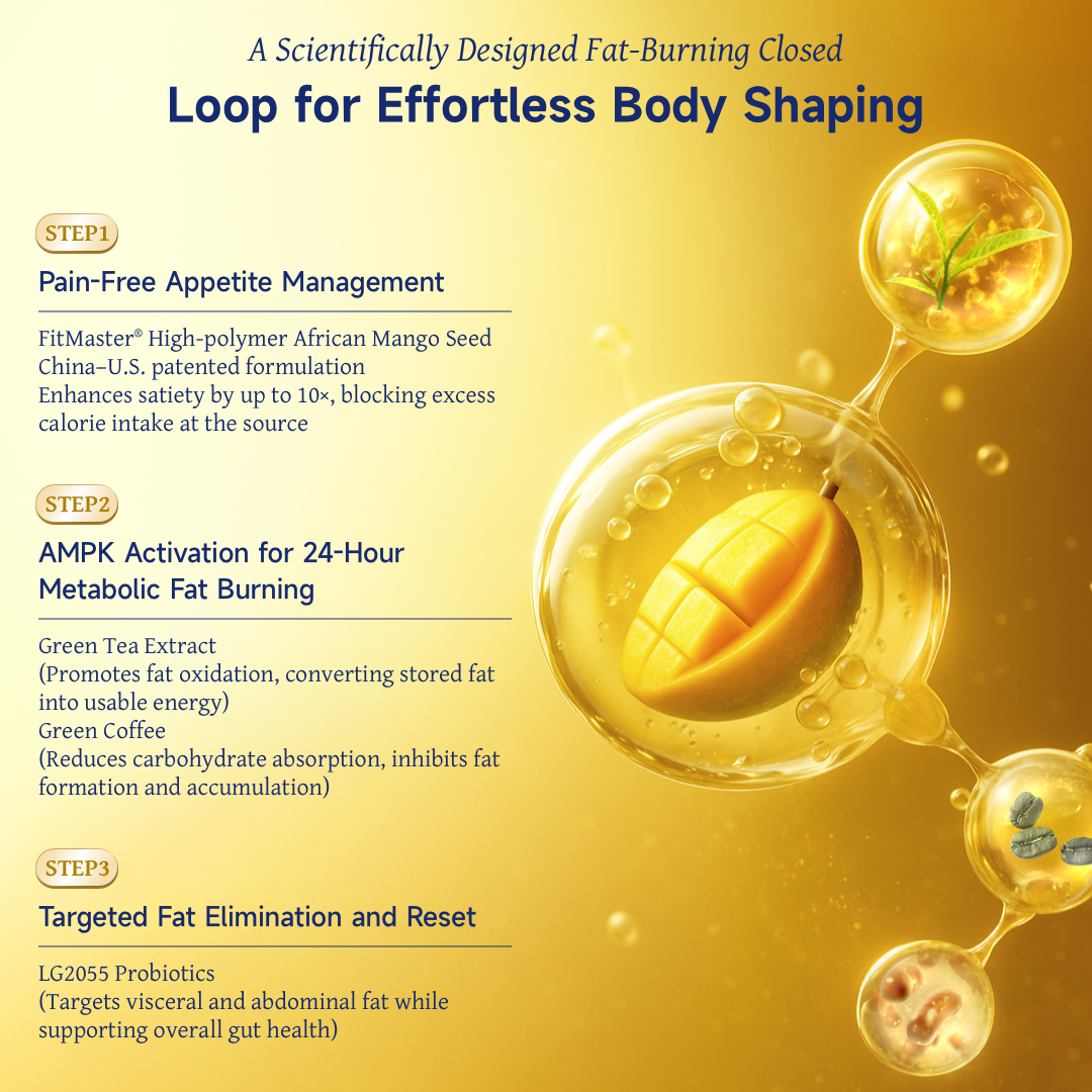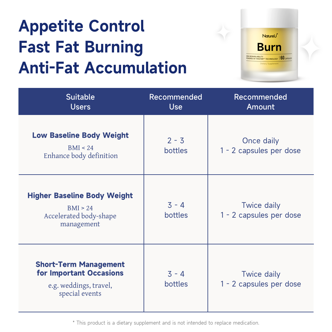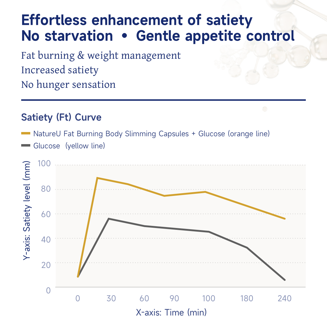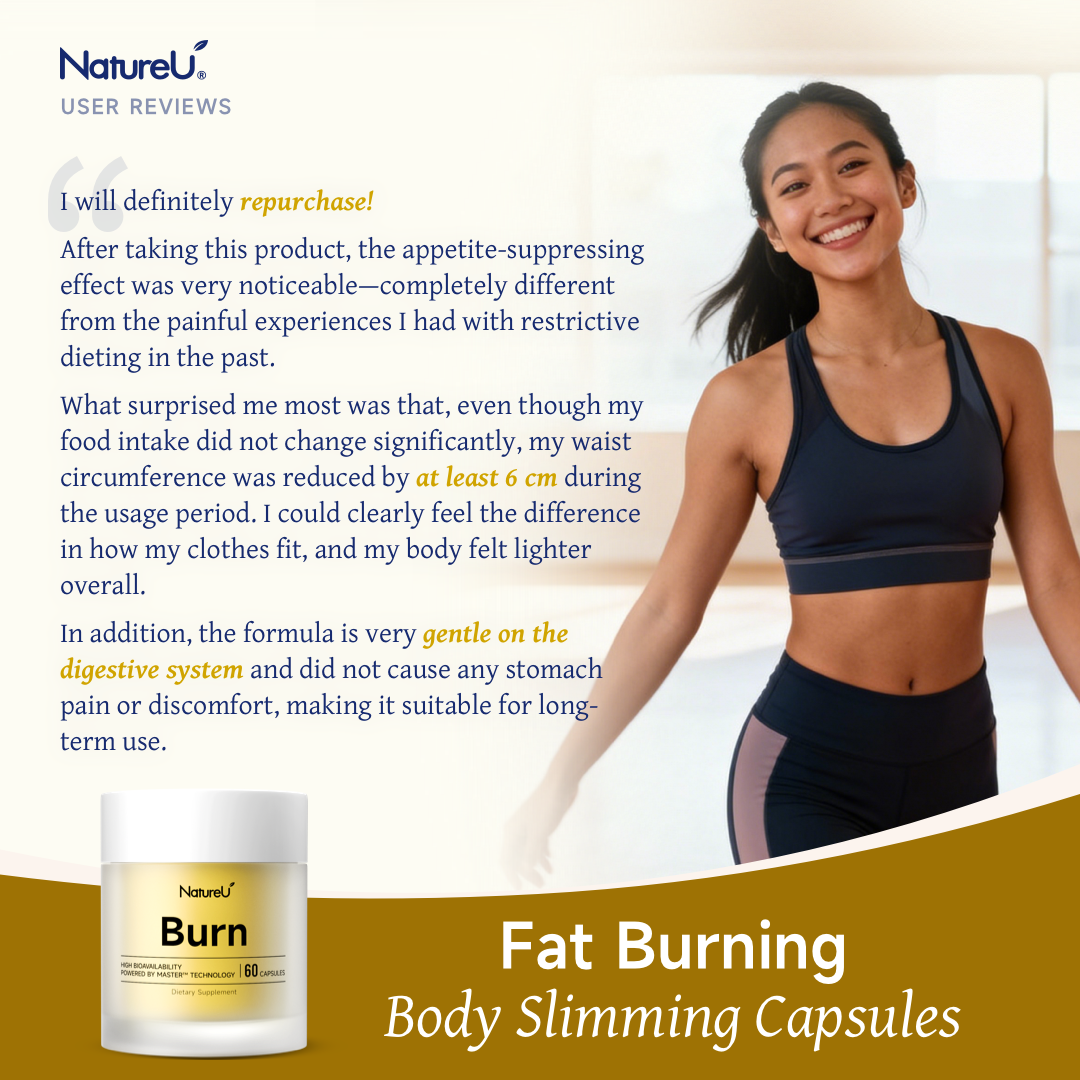 NatureU Body Burn uses natural and safe ingredients to improve leptin resistance, allowing leptin to enter the hypothalamus, enhancing satiety and reducing intake. It boosts metabolism, suppresses appetite, and regulates blood sugar for effective weight loss. This product contains no caffeine, diuretics, laxatives, or stimulants, so it won't affect sleep quality or cause heart palpitations or diarrhea.